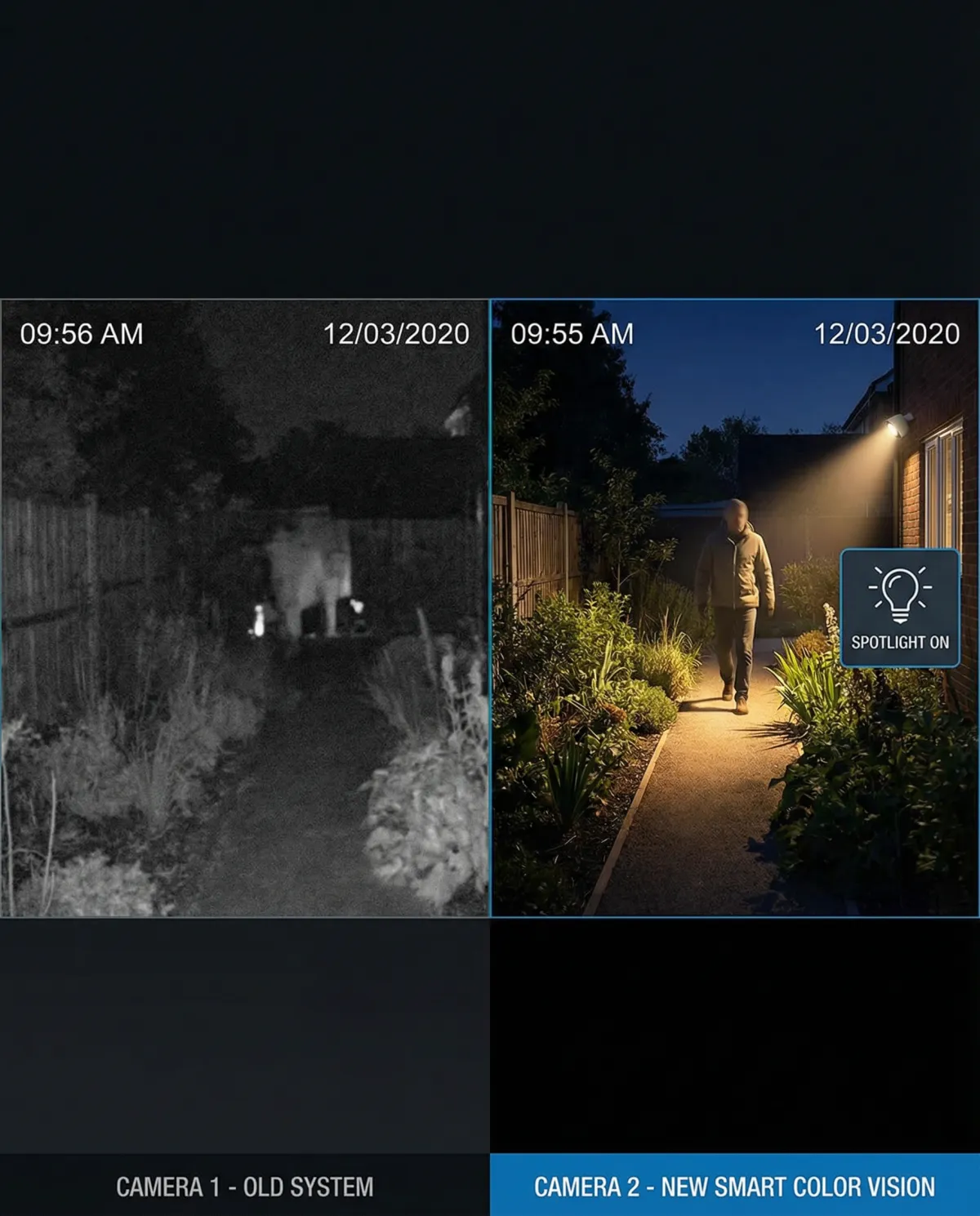 Lente inteligente que activa luz blanca al detectar movimiento para grabar a color, y luz infrarroja para discreción.